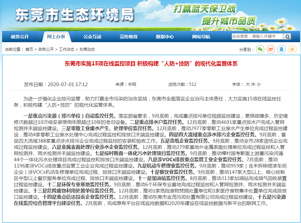 为进一步强化企业排污监管,助力打赢全市污染防治攻坚战,东莞市全面落实企业治污主体责任,大力实施15项在线监控任务,积极构建“人防+技防”的现代化监管体系。